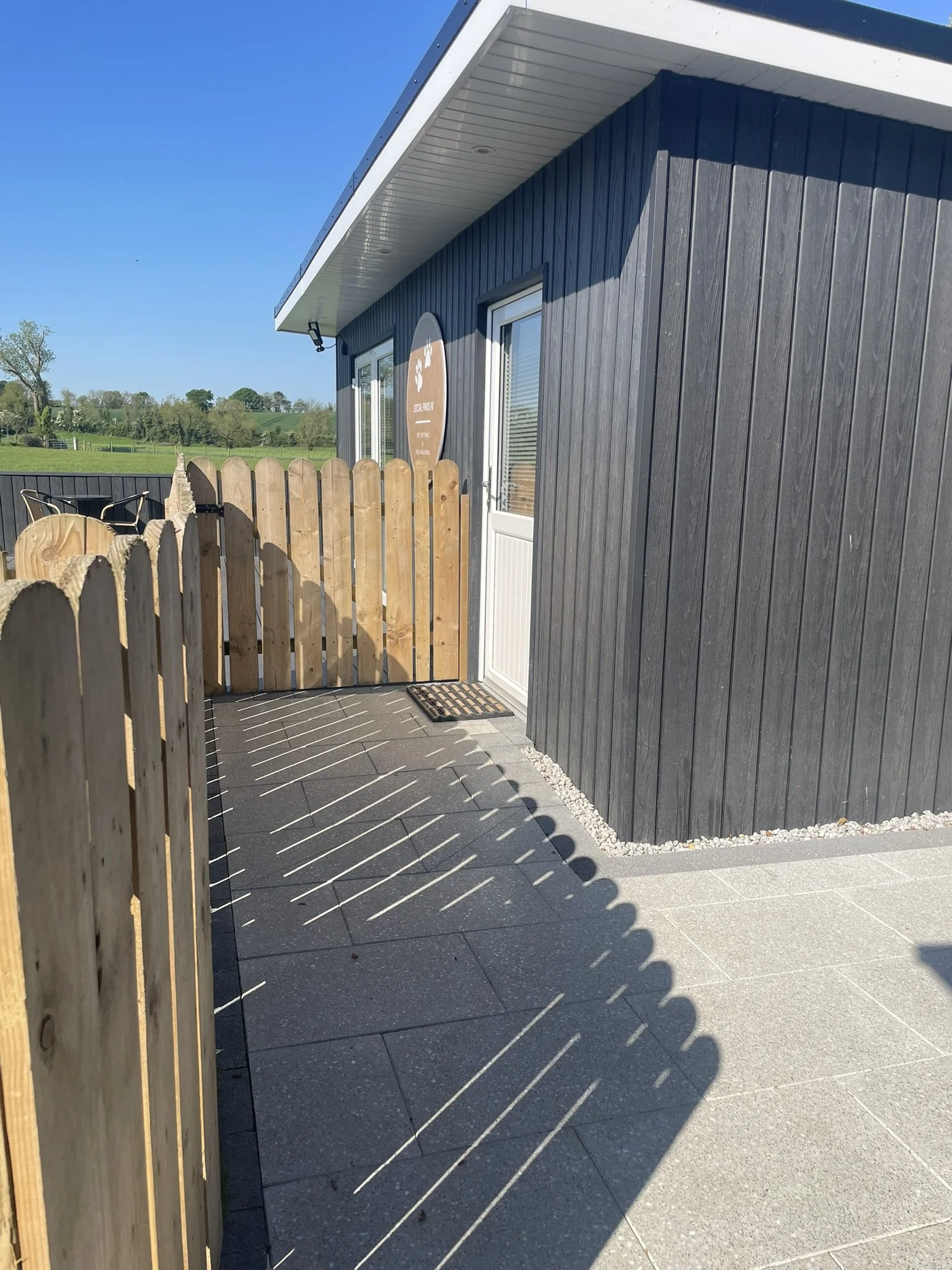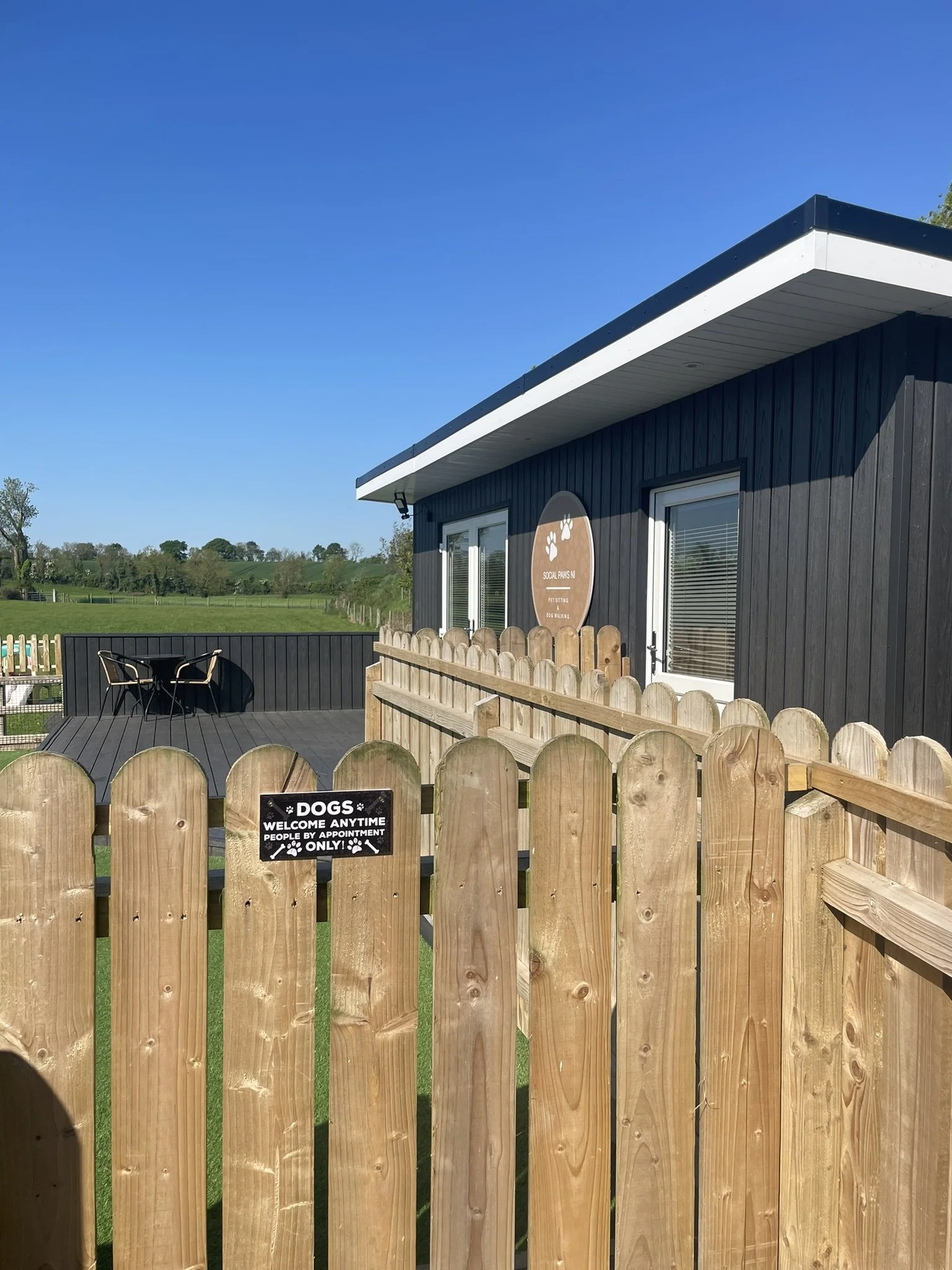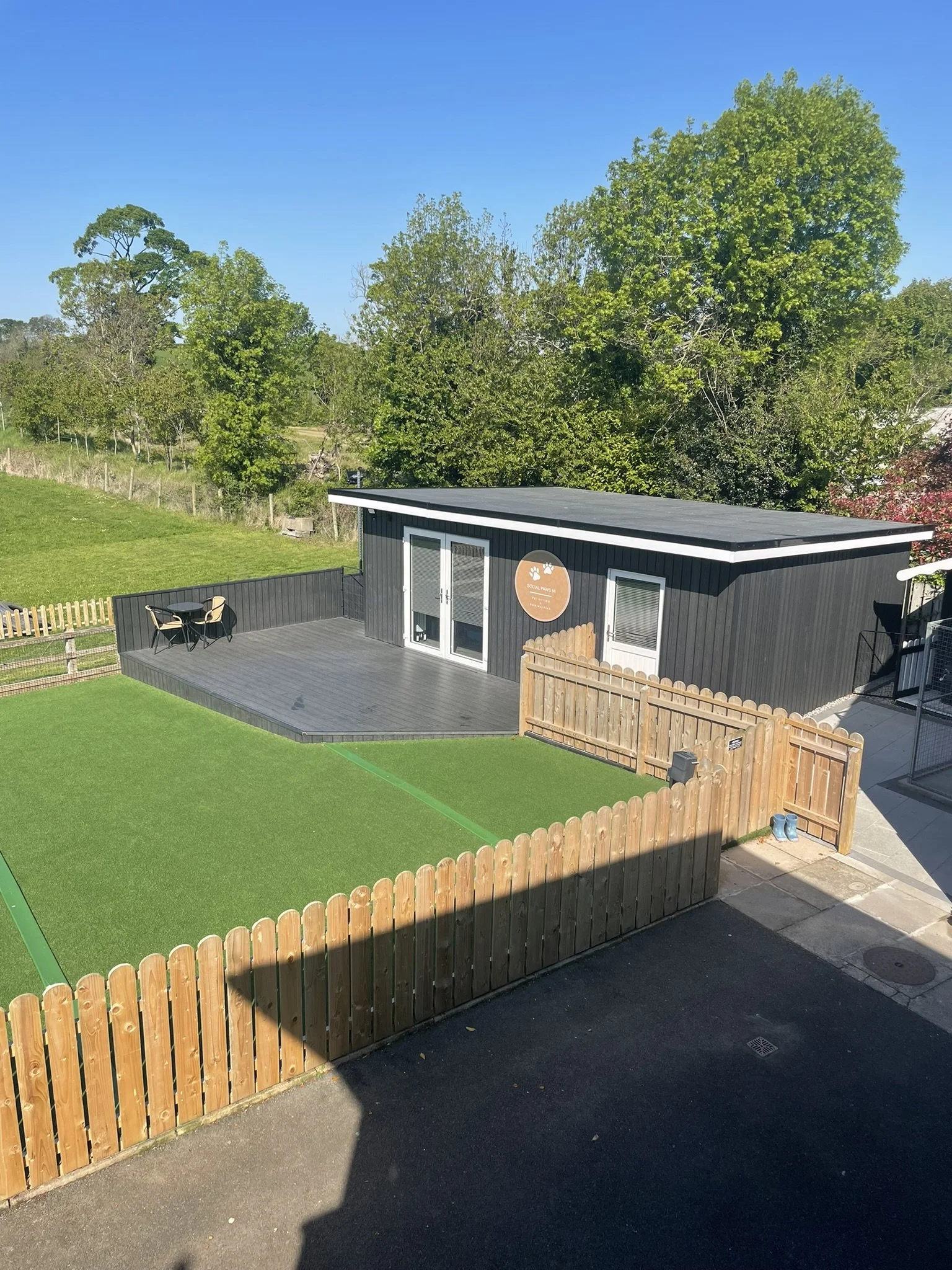 Our uniquely designed headquarters offer a warm and inviting boarding experience, accommodating just 4-5 dogs at a time when fully booked. This allows us to provide personalised attention and care for each guest. The facility features a fully enclosed outdoor area with decking and astro-turf directly accessible from the patio doors, giving your dog a delightful space to enjoy the fresh air and socialise with others. The fencing is 1.2 meters high, ensuring your furry friend stays safe and secure while making new friends.